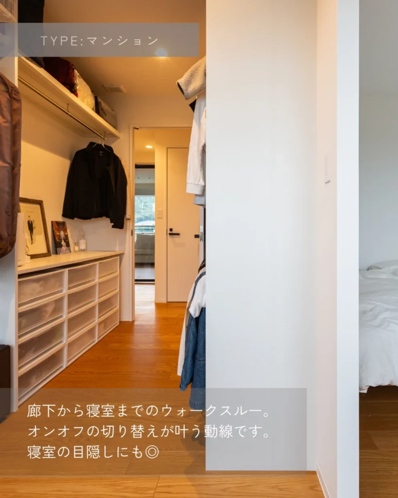 クローゼットが目隠しになるため、廊下から寝室の中が丸見えになりません。また、仕事着からラフな服に着替えるというルーティンが自然と生まれ、「仕事モードからリラックスモードへの切り替え」がしやすくなるという声もあります。