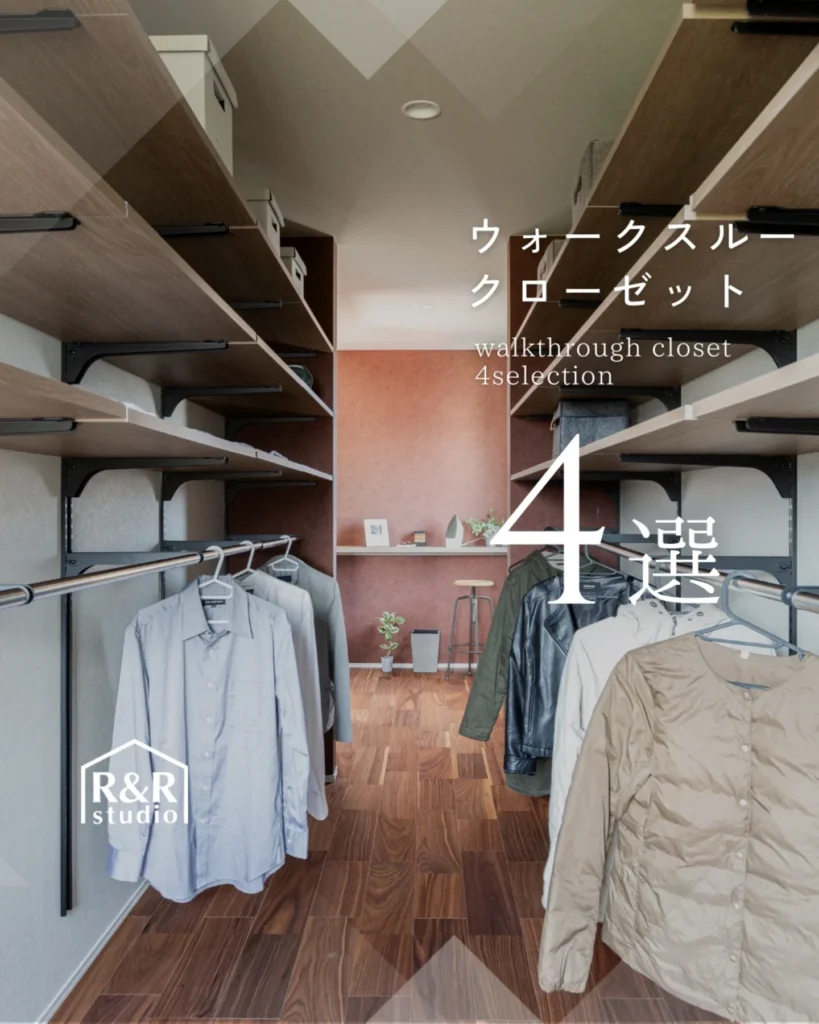 この記事では、R&R studioが手がけたマンション・戸建ての施工事例から、目的別に4つのウォークスルークローゼットをご紹介します。「洗濯が面倒」「リビングが片付かない」「朝の準備がバタバタ」——そんなお悩みがある方は、ぜひ参考にしてみてください。