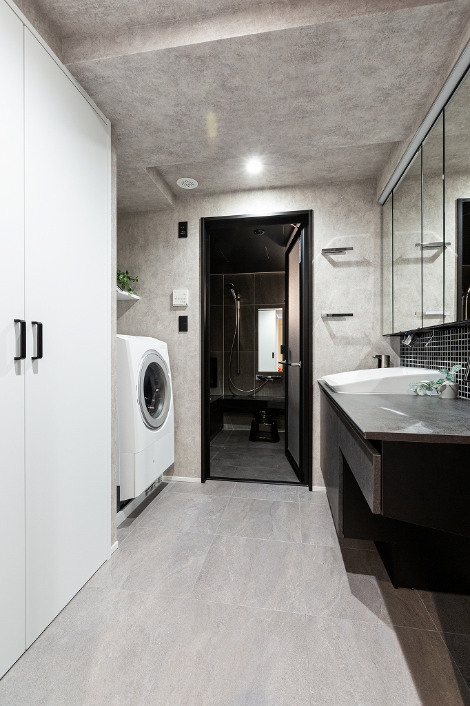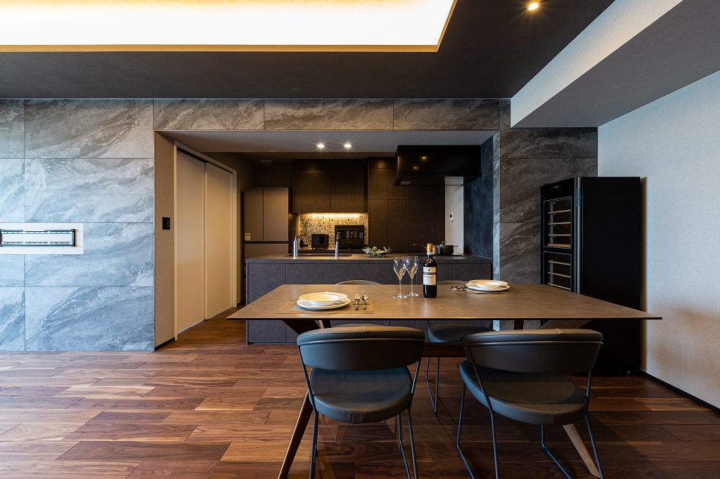 テーマは、ご夫妻が海外旅行先で気に入ったホテルの演出を取り入れた「ホテルライクな広々空間」です。インテリアはアーバンモダンなテイストを基調とし、ウッドとグレーを組み合わせたカラースタイルで、間接照明やタイル使いなど、光と質感で魅せるラグジュアリーな空間が完成しました。