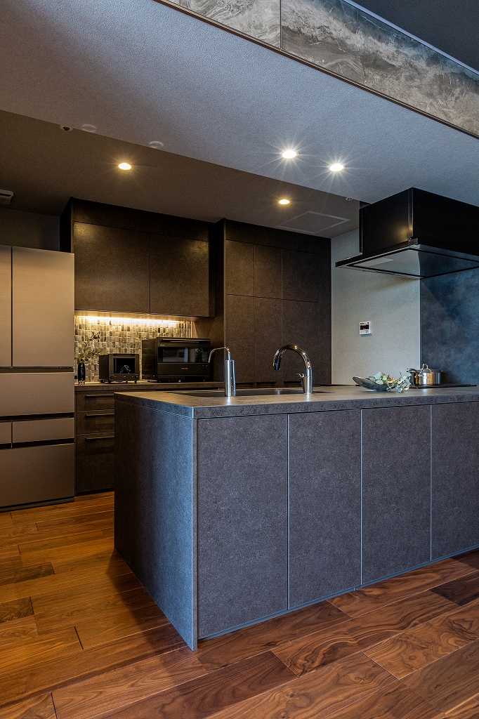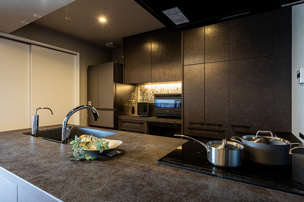 キッチンはLIXIL「リシェル」のグレースグレー色を採用し、家電もブラックで統一することで全体的にダークなトーンでまとめました。