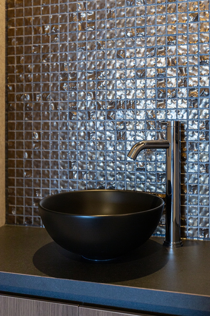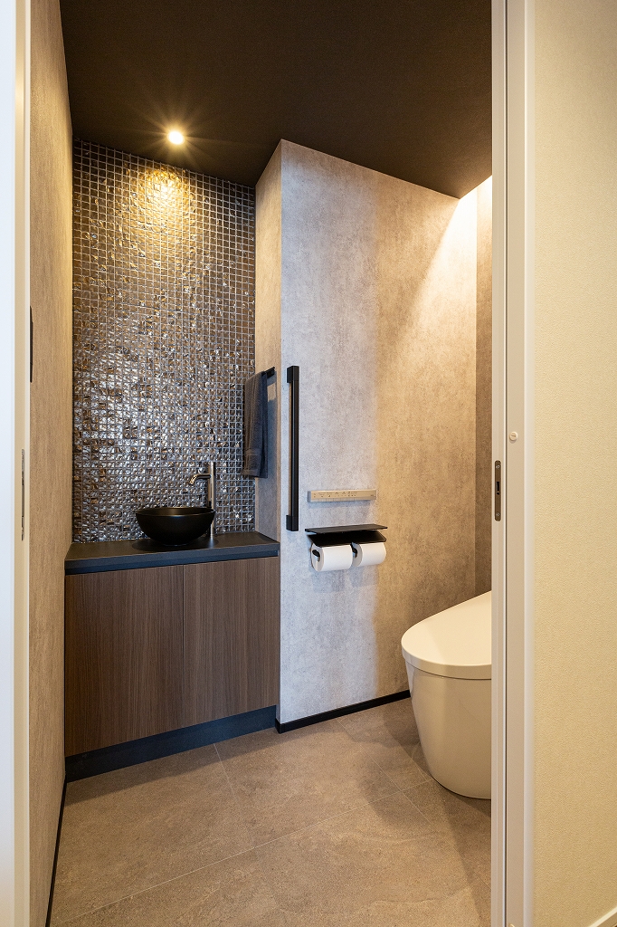 トイレは奥様ご要望のきらびやかなタイルで思い切って華やかに演出。限られた間口には造作手洗いカウンターを設置し、間接照明とタイルを照らす照明で空間をドラマチックに彩っています。