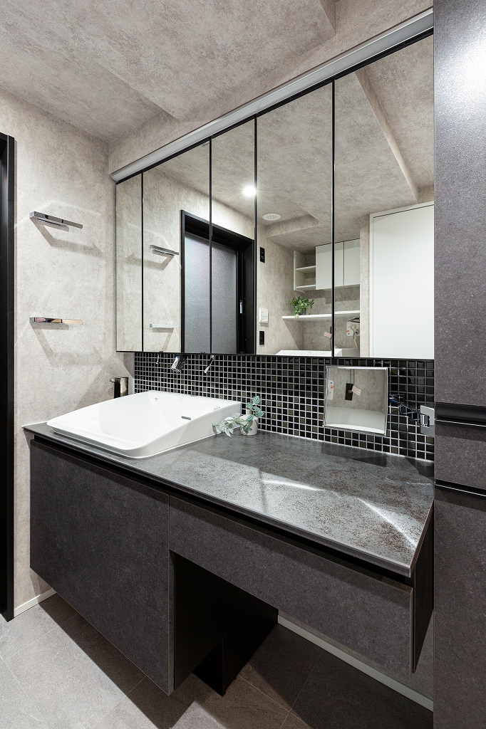 ホテルのような贅沢な空間を追求し、床材には挽き板のブラックウォールナットを採用。大胆に壁一面に大判タイルを貼ることで迫力のある意匠が実現しました。