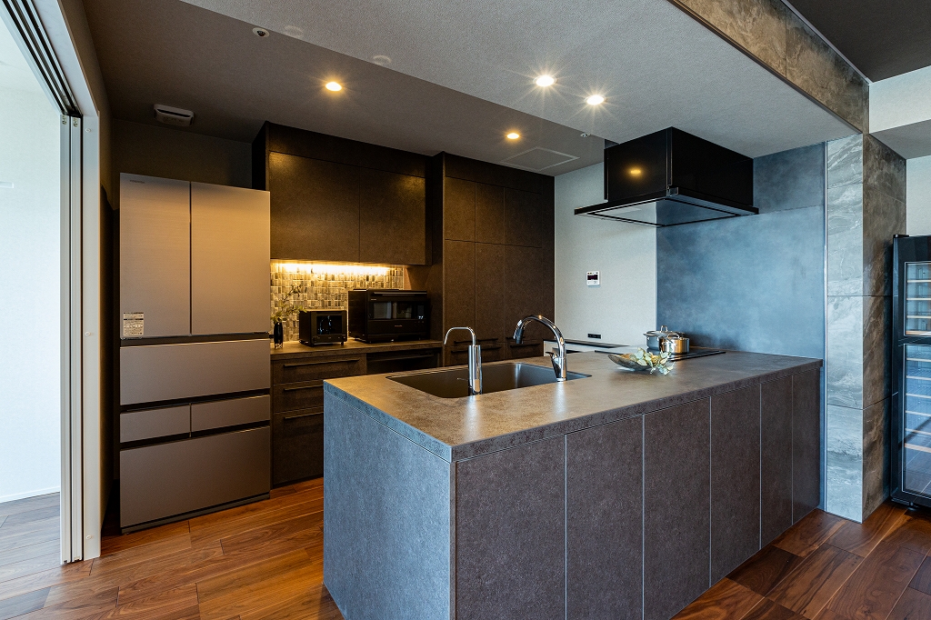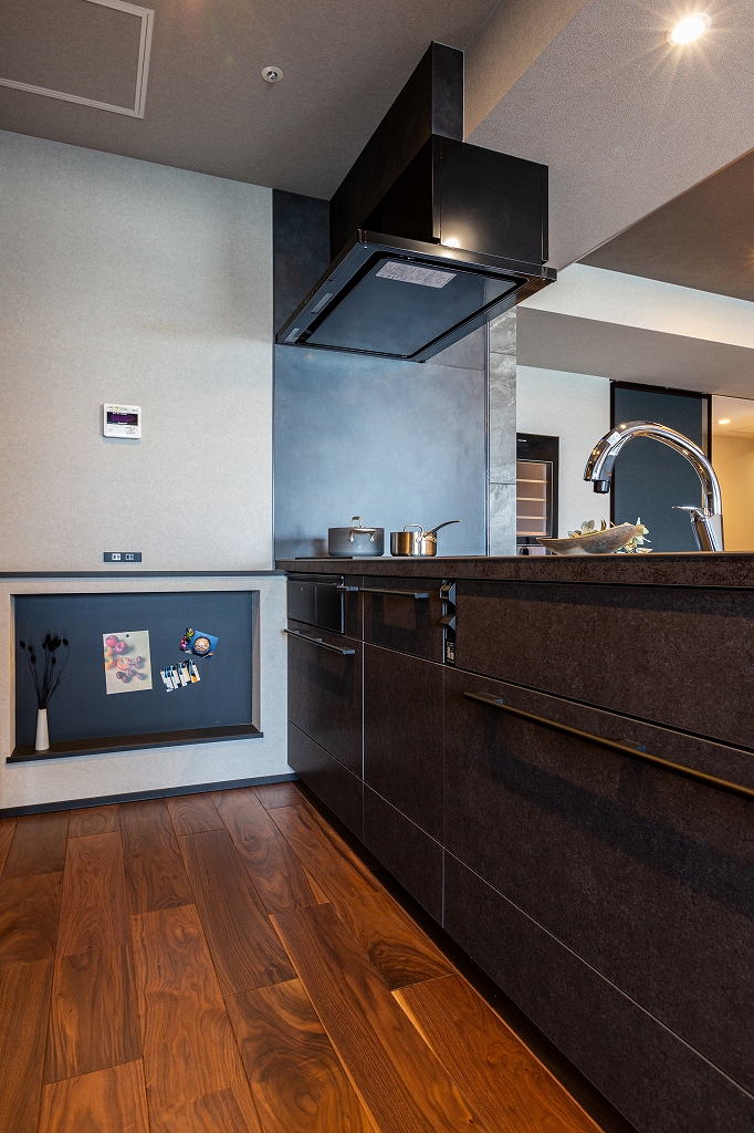 キッチンはLIXIL「リシェル」のグレースグレー色を採用し、家電もブラックで統一することで全体的にダークなトーンでまとめました。