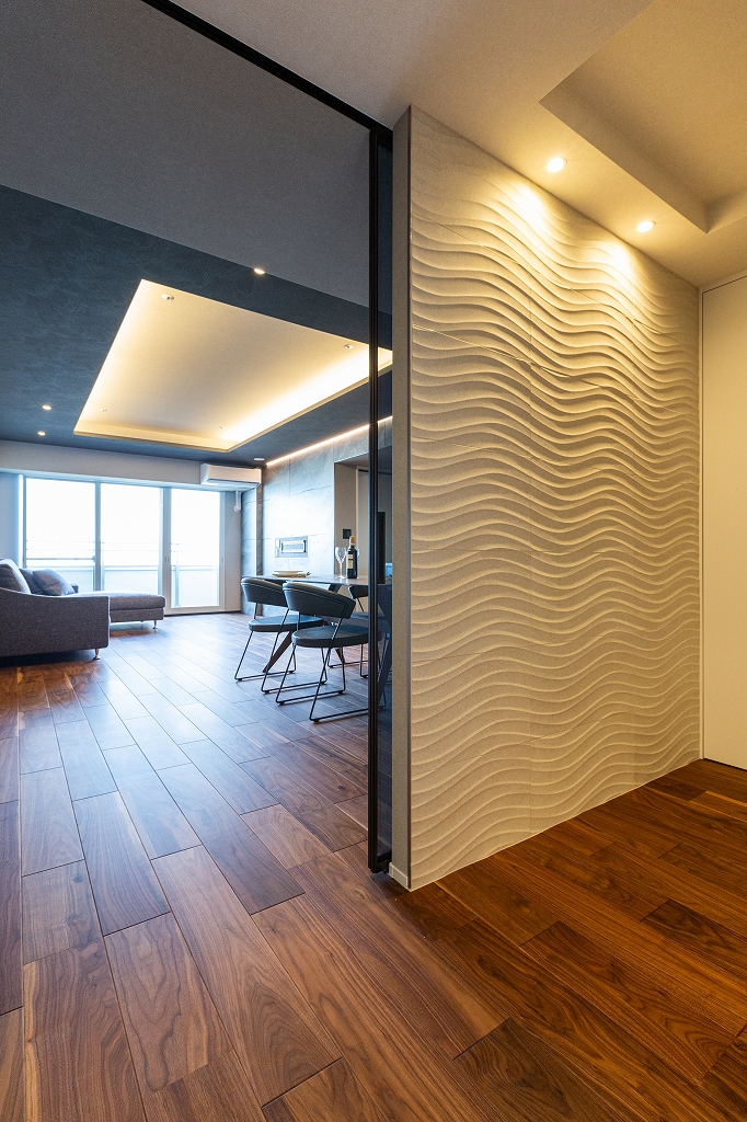 テーマは、ご夫妻が海外旅行先で気に入ったホテルの演出を取り入れた「ホテルライクな広々空間」です。インテリアはアーバンモダンなテイストを基調とし、ウッドとグレーを組み合わせたカラースタイルで、間接照明やタイル使いなど、光と質感で魅せるラグジュアリーな空間が完成しました。