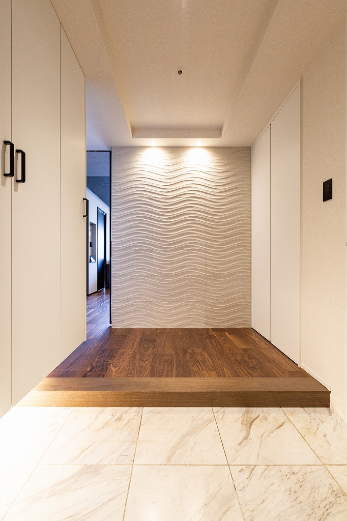 玄関に入って正面の壁には、R&Rスタジオのインテリアコーディネーターと奥様の意見が一致した波型の名古屋モザイクタイル「シルクジャーニー」を採用し、訪れる人を出迎えます。