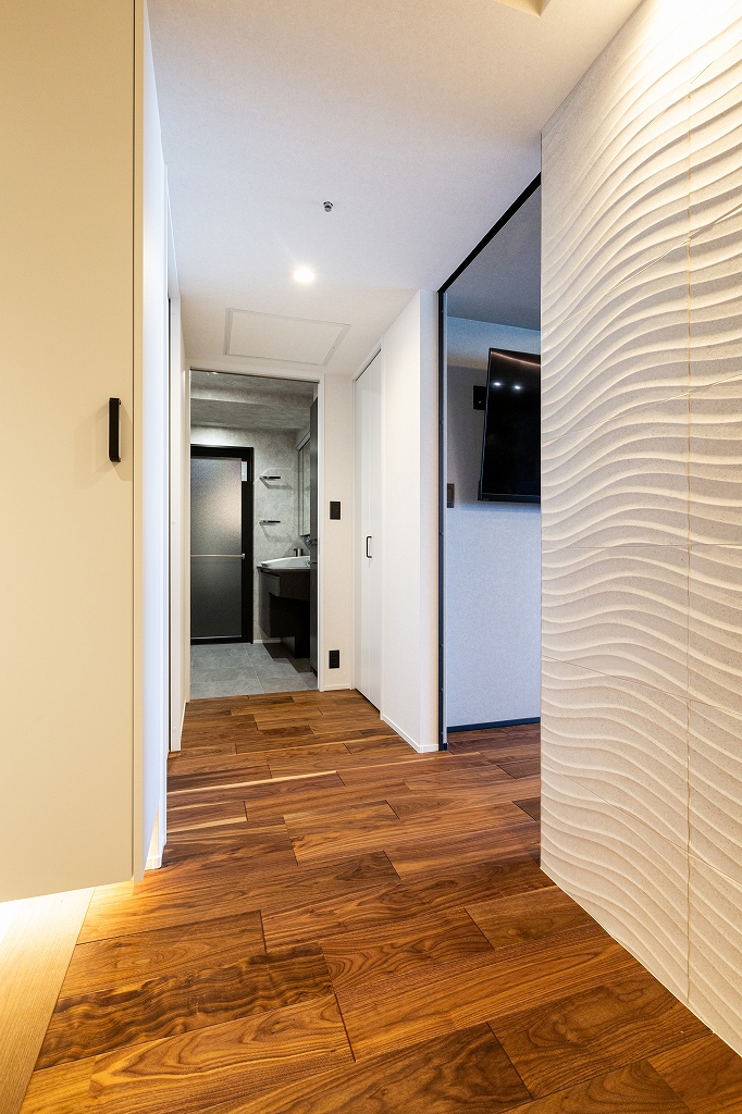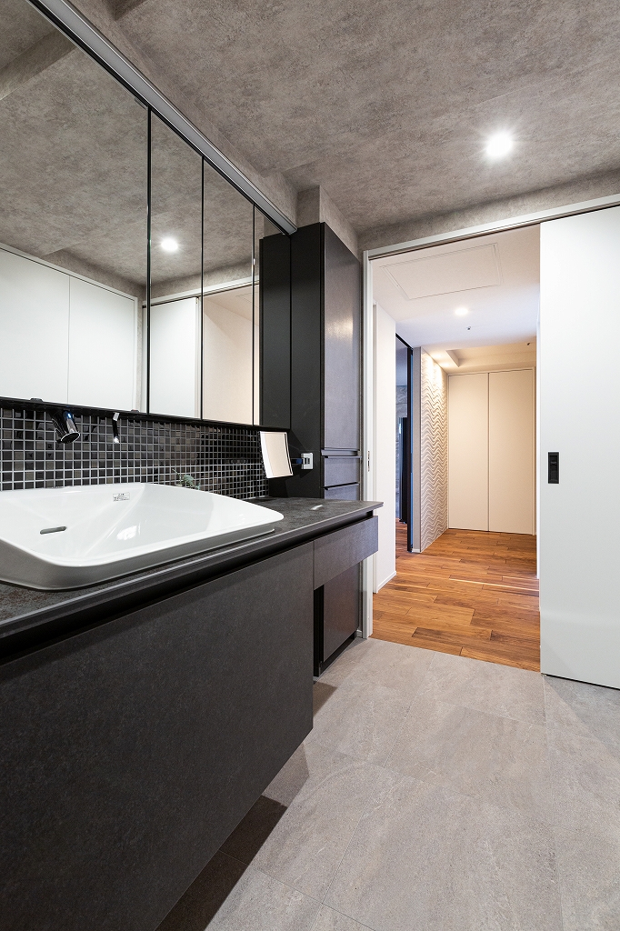 ホテルのような贅沢な空間を追求し、床材には挽き板のブラックウォールナットを採用。大胆に壁一面に大判タイルを貼ることで迫力のある意匠が実現しました。