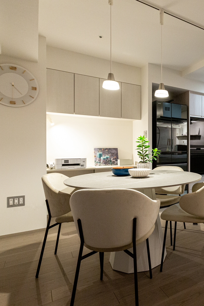 ダイニングの一角には壁のくぼみを利用したパソコンカウンターが。上部には書類用の吊戸棚を造作しています。リビングで使う物を手に取りやすく、使わないときはスッキリと収められる便利なスペースになっています。