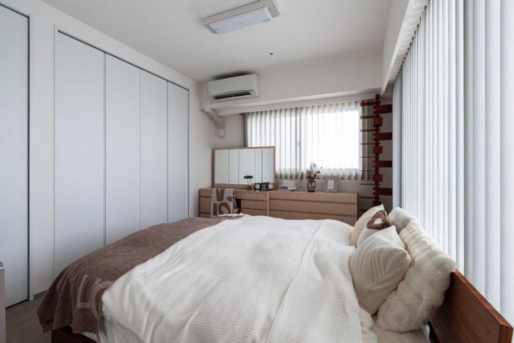 隣接する寝室側の収納の奥行きを生かして、下半分を脱衣室側の収納スペースにしました(写真右)。その上には洗濯カゴなどが置けるスペースも。エアコンも新たに設置しています。