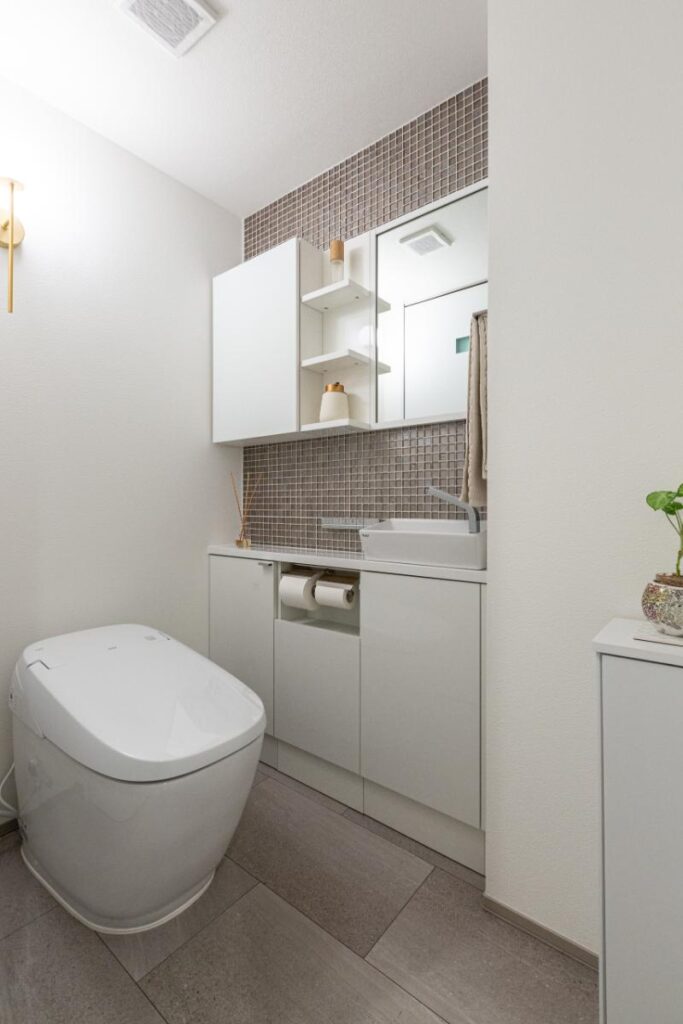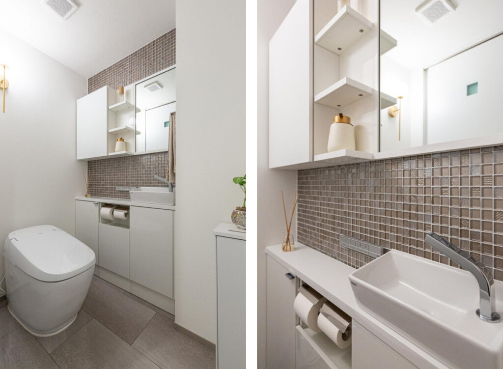 床にはサンゲツの大判タイル、壁には名古屋モザイクのタイルを使用し、限られた空間であってもしっかりとコーディネートされたインテリアで高級感を演出しています。