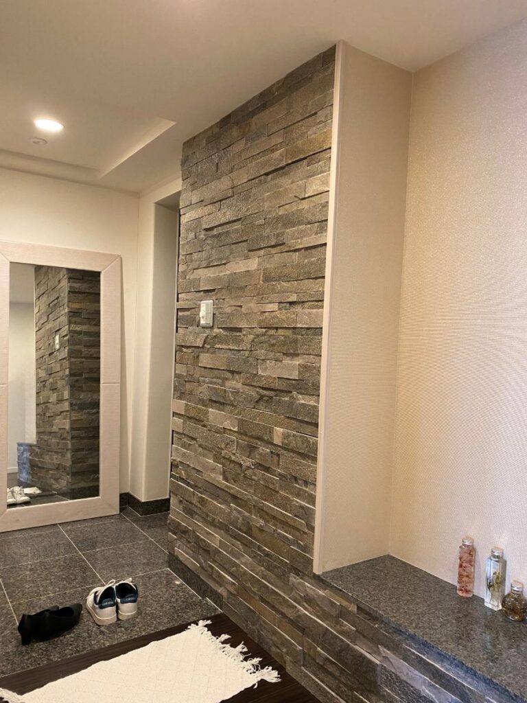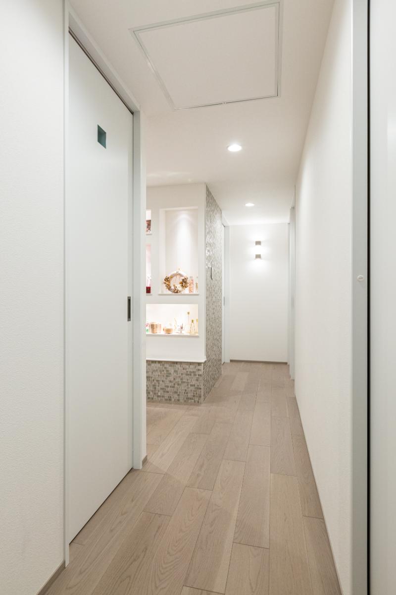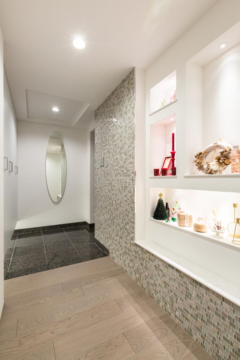 玄関から入って正面にある収納を交換し、下部に間接照明を設置。ホールの壁面には、奥さまの作品(ハーバリウム等)を飾るためのアートコーナーとして、ニッチを造作しました。