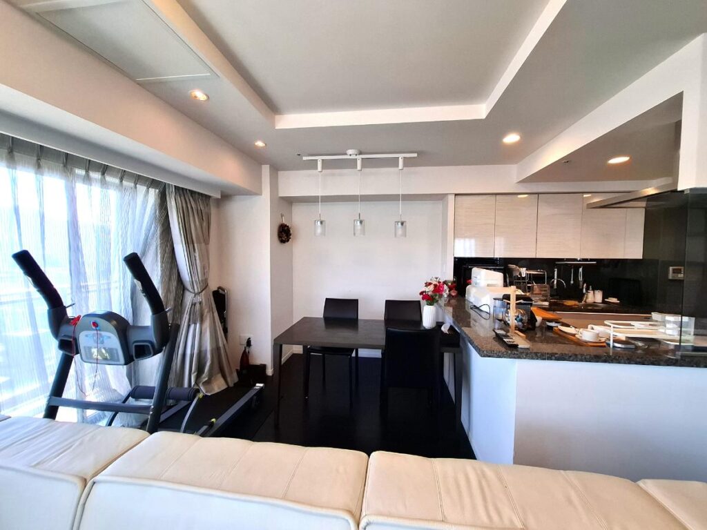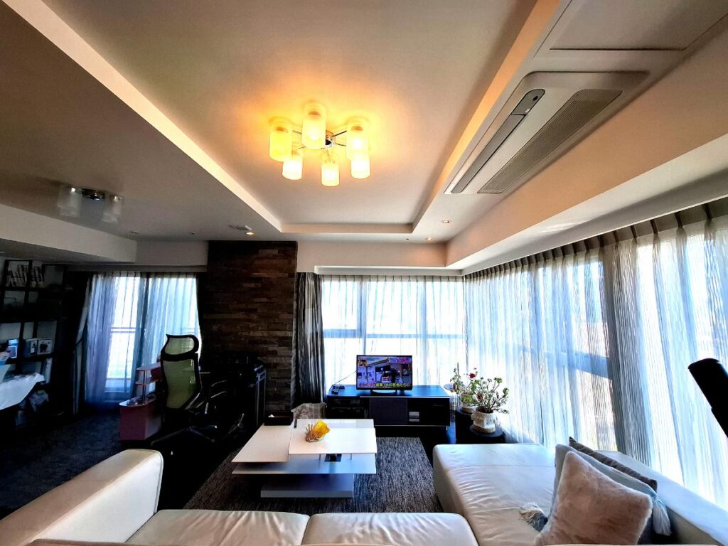 大きな窓が連続した明るいLDK。折り上げ天井で開放感が増しています。折り上げ天井を極力広げるために、既存のダウンライトだけでなく、難しいスプリンクラーの移設も実施。天井埋込型エアコンを交換し、空調設備も新しくなりました。