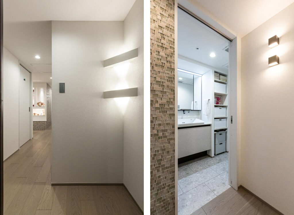 廊下のコーナーや壁面の照明は、2つずつ上下で配された個性的なデザイン。